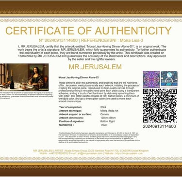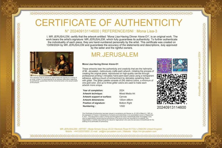 The purpose of this verification is to check the validity of the seals attached to the artwork and the Certificate of Authenticity-in order to be absolutely confident that you are the owner of the artwork.